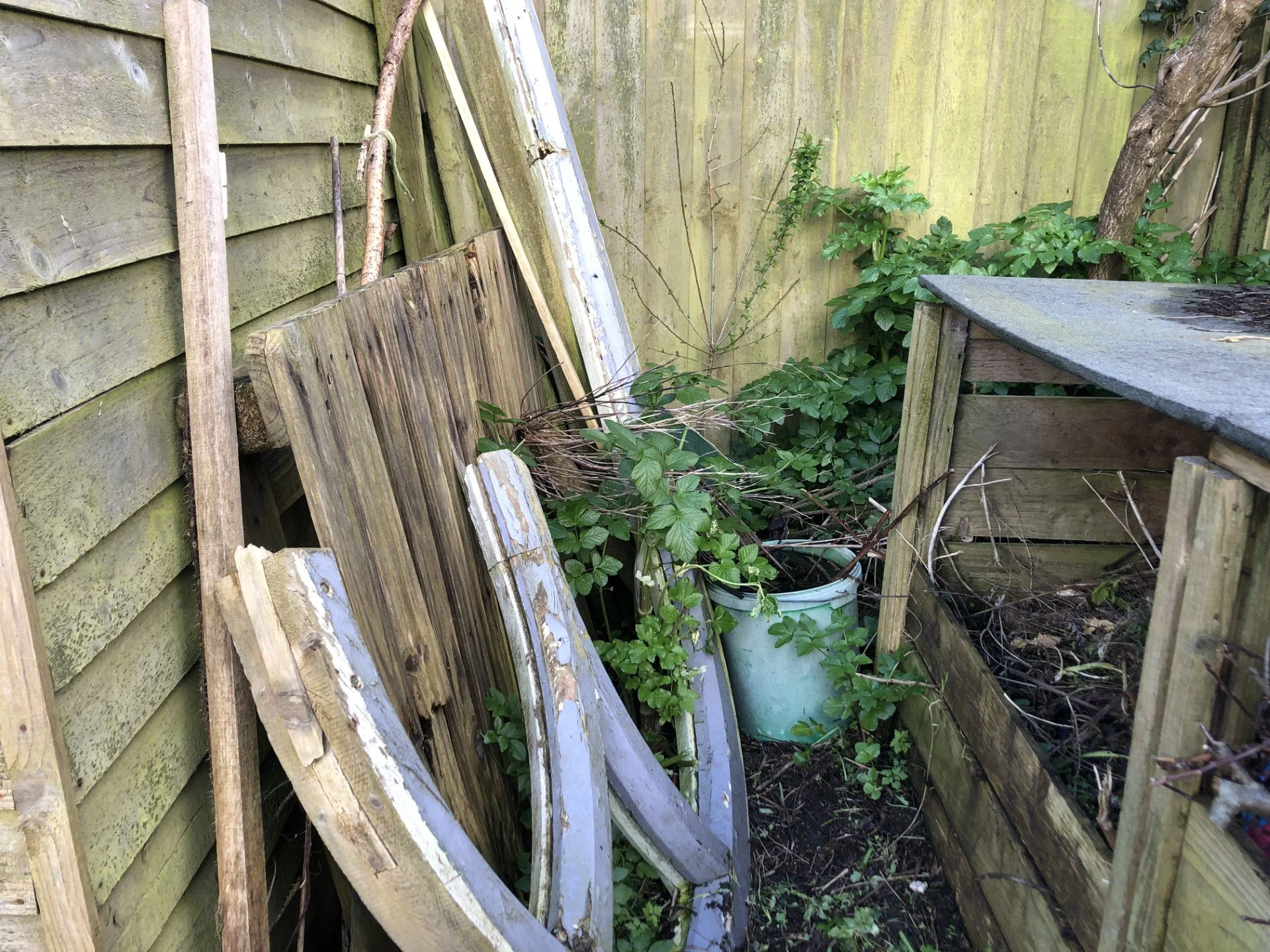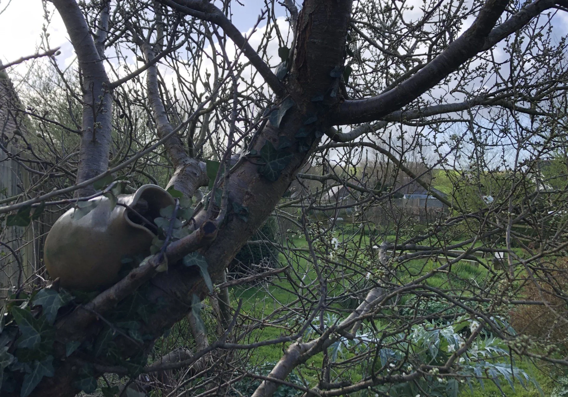 Then my phone battery got low, so I reluctantly had to walk back to the office to charge it. Then, I went back out into the garden and spotted many things that I hadn’t noticed before - including a lovely pottery jug propped up in the branches of the fig tree. I was curiously drawn to the compost bin and pieces of wood nearby that had been taken out of the chapel when we renovated - ready to be repurposed in the garden as ‘features’.